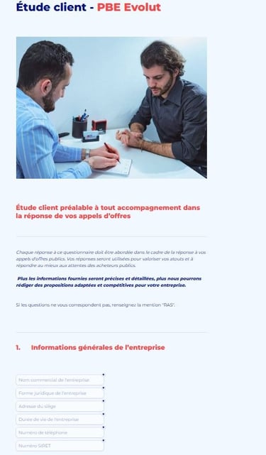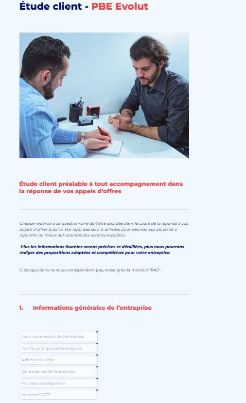 Analyse approfondie de votre entreprise sera effectuée afin de détenir les informations nécessaires sur vos références vos moyens humains et matériels ainsi et de votre positionnement afin de valoriser votre profil auprès des acheteurs publics.Lien d'accès à votre étude : https://tally.so/r/w8GxN5