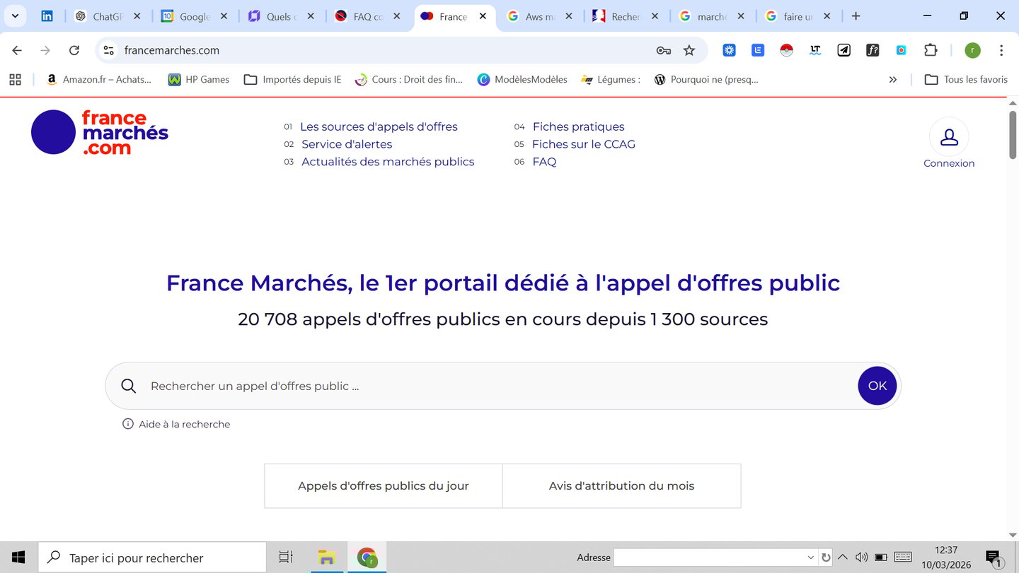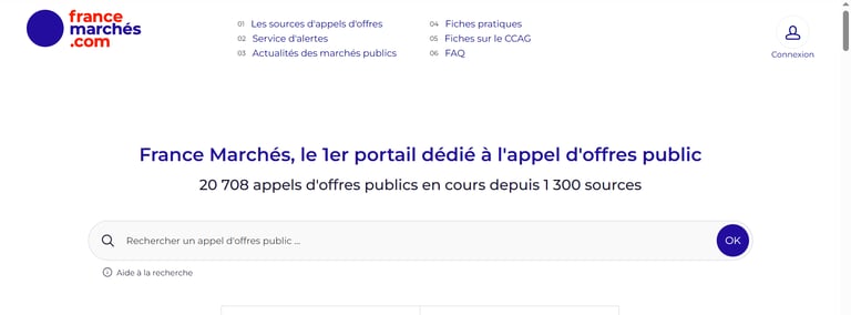 France Marchés (francemarches.com) Portail gratuit de référence, il agrège les avis d'appels d'offres issus de plus de 300 sources : journaux régionaux, BOAMP, JOUE et sites d'acheteurs publics. Particulièrement adapté à la détection de marchés locaux et nationaux pour les TPE-PME.