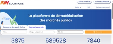 AWS – Achat Web Services (aws-achat.com) Plateforme de dématérialisation permettant de consulter les consultations publiées par les acheteurs publics, de paramétrer des alertes ciblées et de répondre aux appels d'offres directement en ligne.